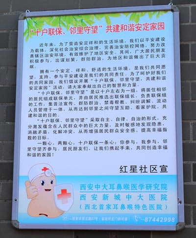 “十里联保邻里相望”,共建合谐安定家园。2012年11月1日,西安新城中大耳鼻喉医院热衷做社区文明宣传先锋,与社区合作共同制作宣传墙体。居民们也纷纷表示像“十里联保,邻里相望”这种关注居民安全,考虑居民民生的标语深受欢迎。